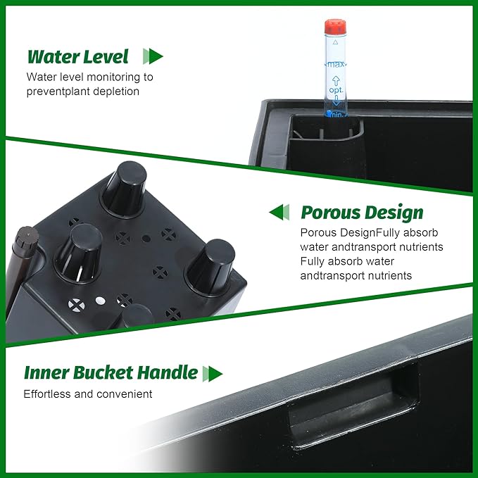 - Automic Watering System: Each tall black planters comes with built-in drainage holes and a sink to ensure that your greenery absorbs water smoothly and minimizes root rot. When the water level is low, the automatic watering system kicks in to provide your plants with the necessary moisture with minimal effort