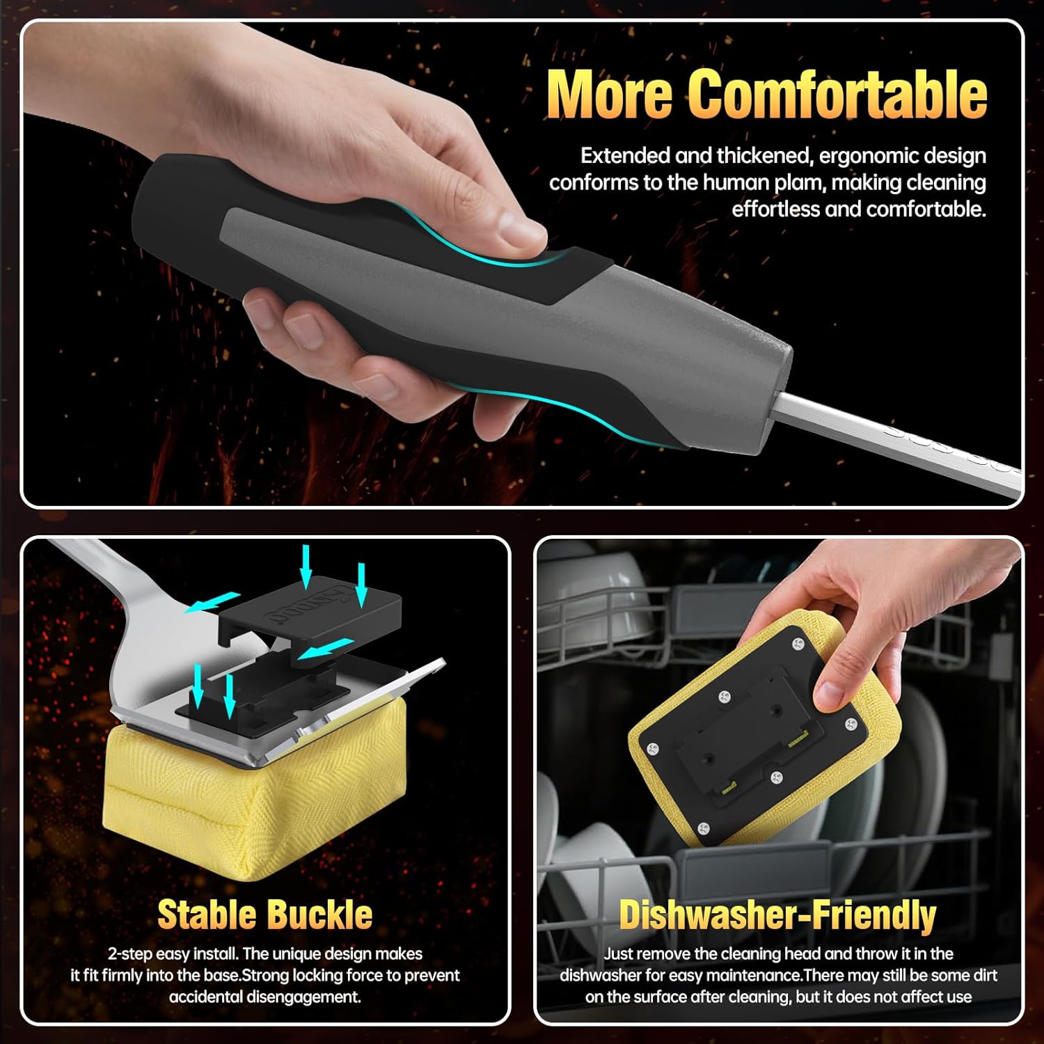 - 【Extended Ergonomic Handle】After multiple rounds of research and improvement, the ergonomic handle features a two-sided curved design and a thickened grip for a stronger grip that is comfortable and effortless. The extended handle is longer than other barbecue brushes on the market, keeping you away from the grill to avoid steam burns.The brush cleaning head is removable and features a safety clip mechanism for greater stability on the handle