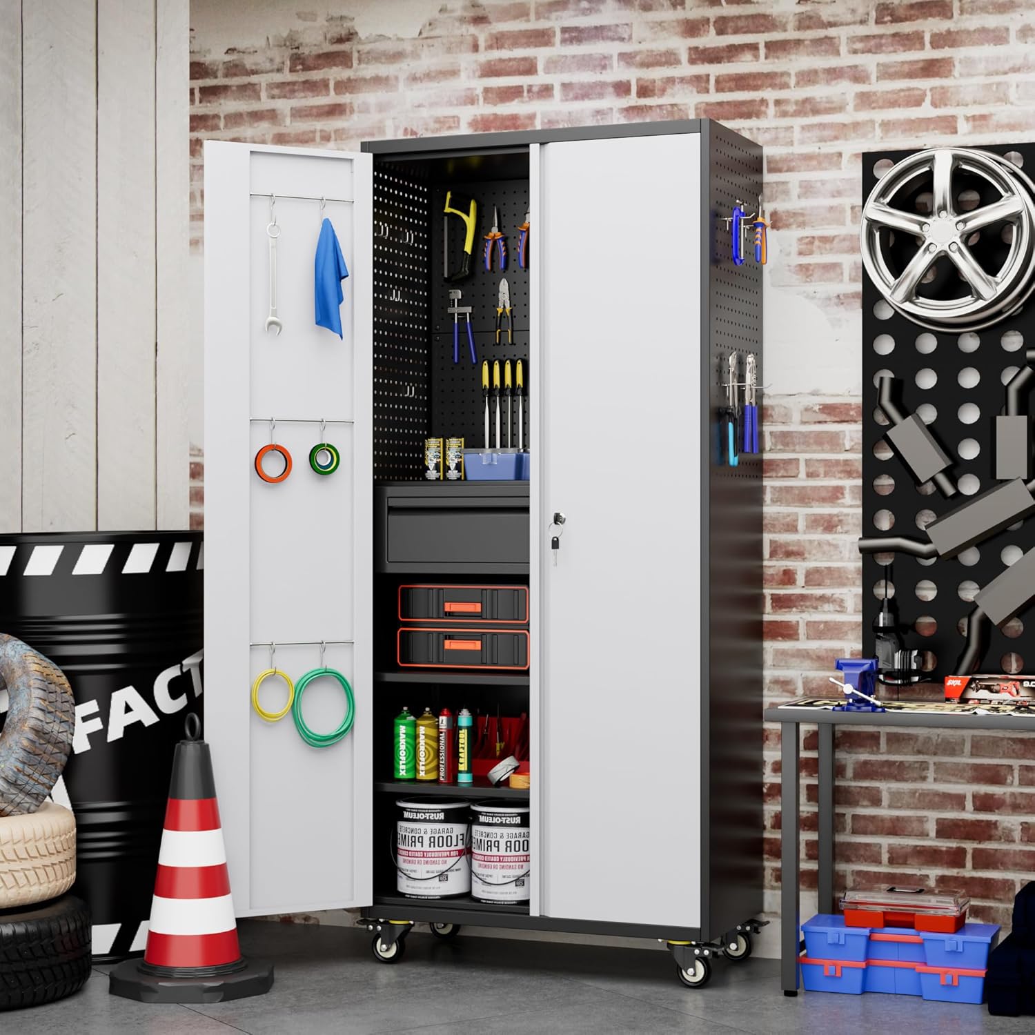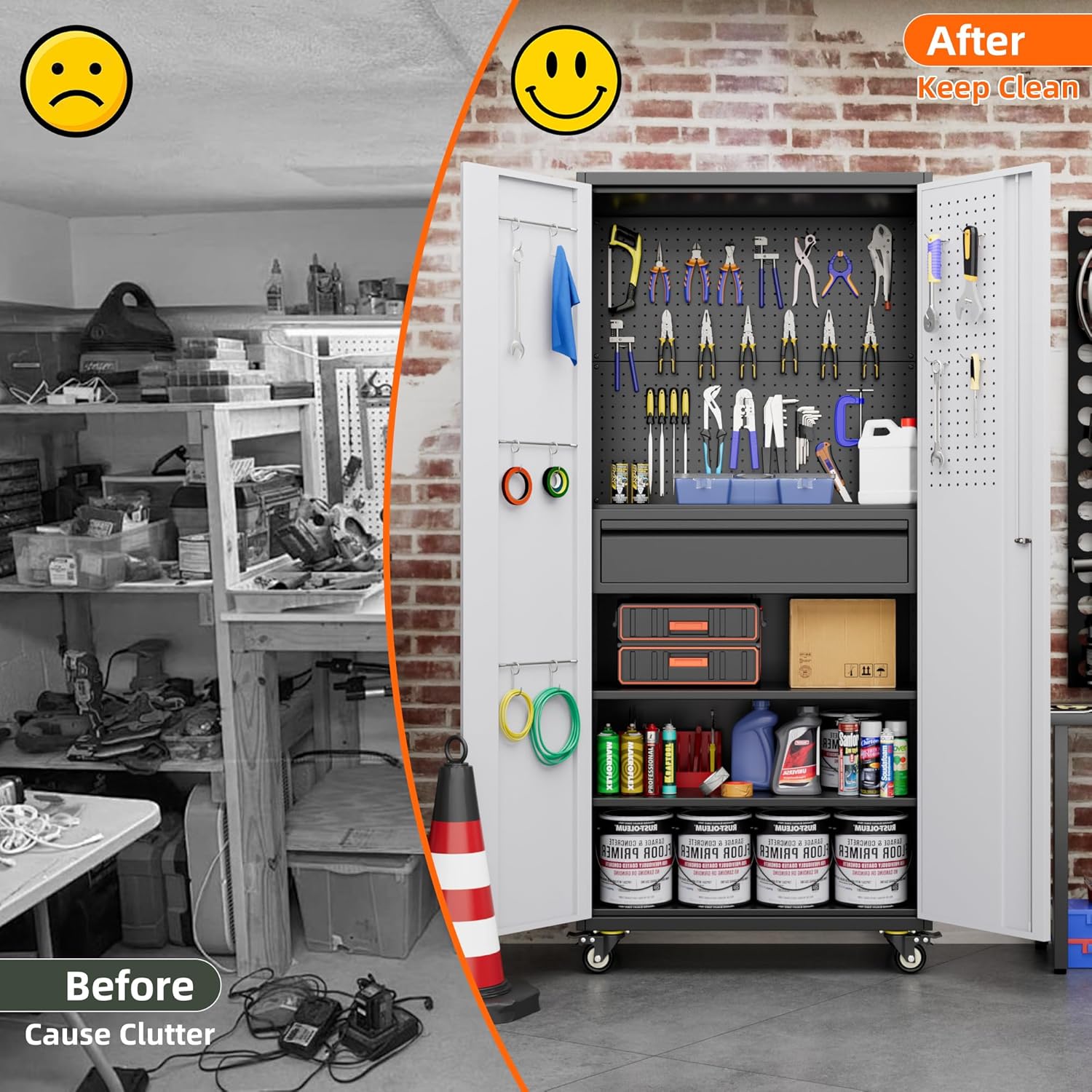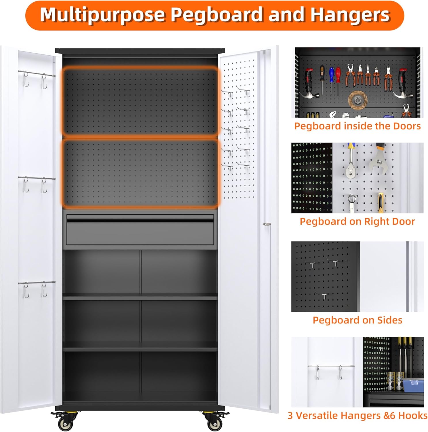 - 【Upgraded Design & More Space】 Storage cabinet offers plenty of space to meet your storage needs. There are pegboard on the cabinet right door and 2 Sides. The left door has a hanging rod and 6 small hooks. Open the door and inside there is a big drawer