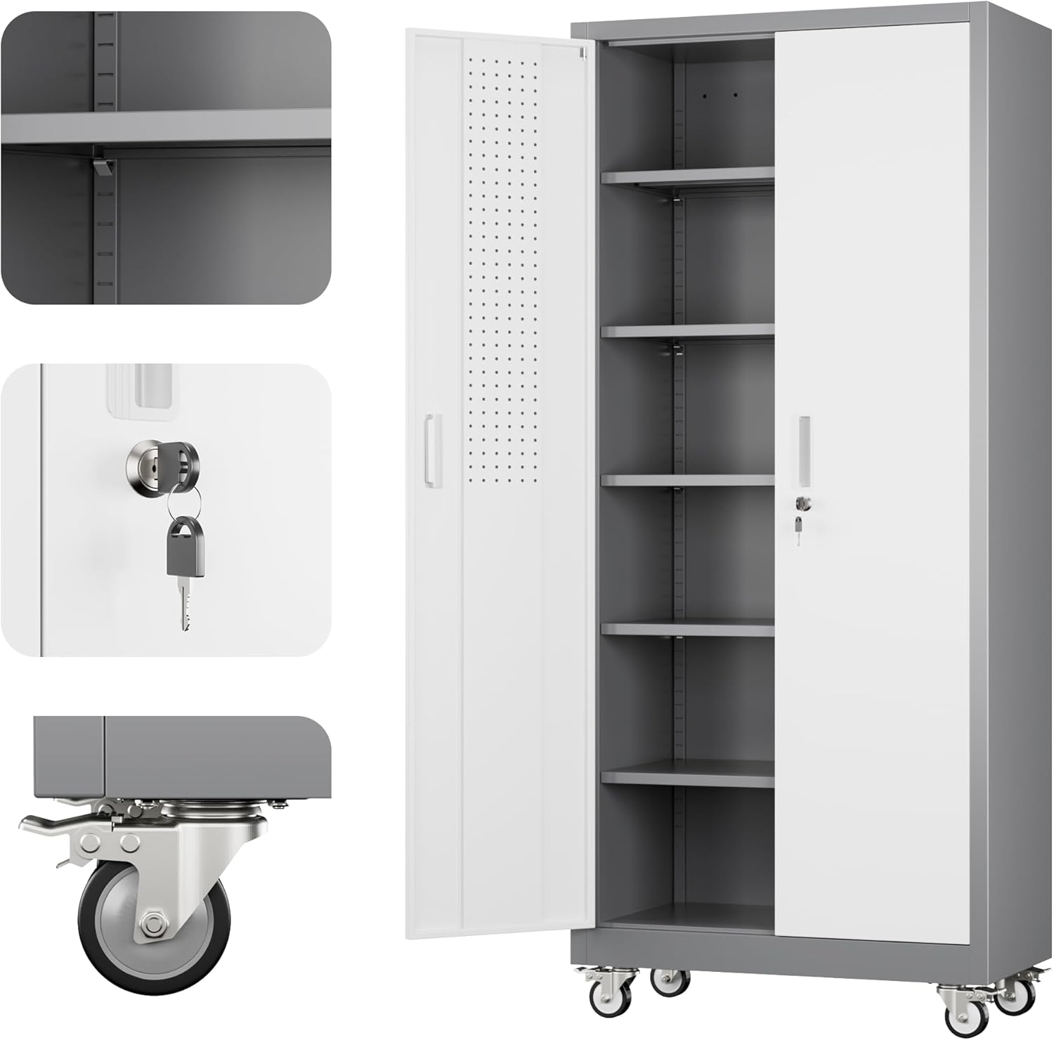 - Metal Storage Cabinet : Metal storage cabinet has 5 adjustable and removable shelves that can be adjusted while ensuring maximum adaptability and convenience to meet your own unique storage and organization needs. Metal storage cabinet have 2 round pegboards and 4 hooks, and if you need more you can easily buy more suitable hooks