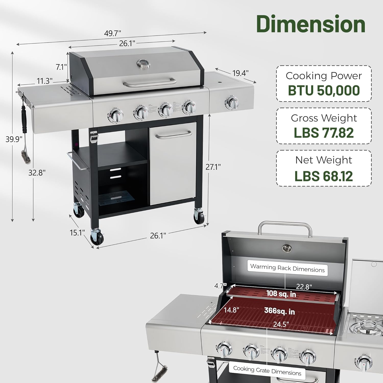 - PORCELAIN-ENAMEL CAST IRON GRATES: The grill features a 366-square-inch high-temperature, easy-to-clean cooking grate and a 108-square-inch 430 stainless steel warming rack, ensuring even heat distribution and excellent heat retention for consistent and reliable cooking results