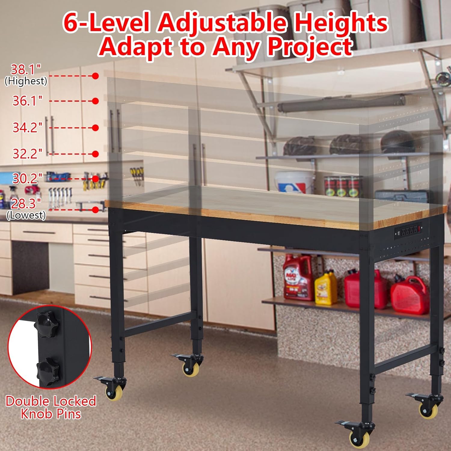 72" x 25" Heavy-Duty Adjustable Workbench with Power Outlets - 2000LB Capacity Garage Workbench, Rubberwood Top, Locking Wheels, Mobile Workstation for Workshop, Office & Home