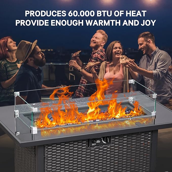 - 60,000 BTU CSA-Certified Fire PitTable: Elevate your outdoor gatherings with our 43" propane fire pit table, engineered to deliver up to 60,000 BTUs of comforting heat—perfect for extending your backyard evenings well into cooler seasons. The stainless steel lid doubles as a functional dining surface, seamlessly transitioning from fire pit to table. Please note that the gas tank and propane should weigh less than 20 pounds, and the gas tank itself is not provided