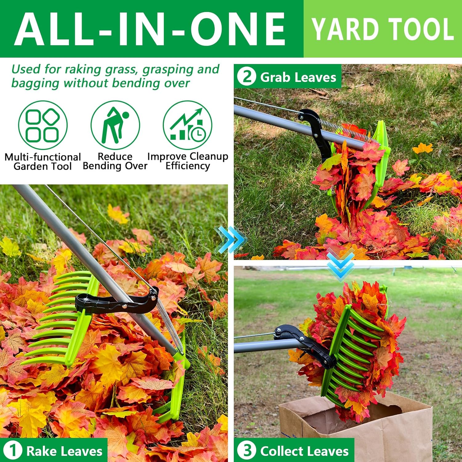 - 2-In-1 Leaf Rake Grabber: Our upgraded leaf cleanup tool integrates the traditional functions of leaf raking and leaf picking, combining raking, grasping and bagging into a smooth set of actions, greatly simplifying and accelerating the yard cleaning process. No additional tools are needed, the leaf rake grabber effortlessly clears the fallen leaves all over the ground, perfectly replacing the traditional leaf rakes