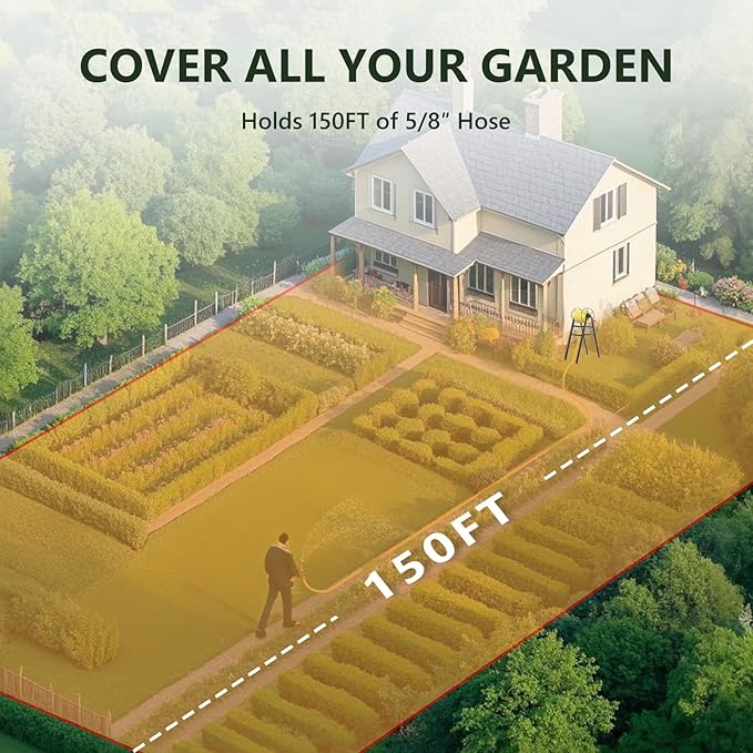 - 【Extra Large Storage Capacity】: This hose storage rack can perfectly accommodate a standard 5/8-inch garden hose up to 150 feet in length, easily covering every corner of a large yard. Whether it's the front lawn or the back garden, one hose is enough to meet all your watering needs. (Note: This product only includes the guide hose, and the main hose needs to be purchased separately.)