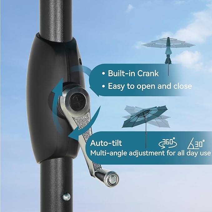 - Easy to Adjust: This umbrella Outdoor patio is designed with crank opening system and easy to adjust, it can be easily opened, closed and tilted from 0-45° through the hand crank adjustment, which is easy and quick to use, and it can provide more angle of shade protection and better shading effect.