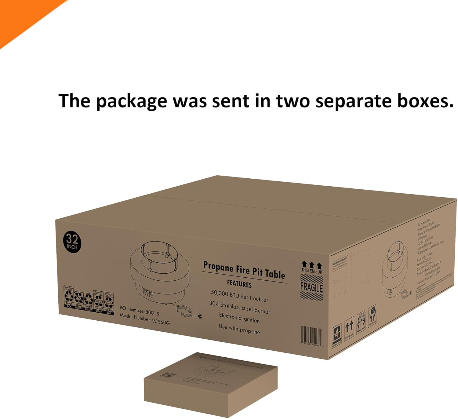 - Natural Gas Conversion Kit - Includes a natural gas converstion kit, which will be shipped separately. Converts propane fire pit tables to natural gas. We shipped the package in two separate boxes, It is possible that one package will arrive before the other.