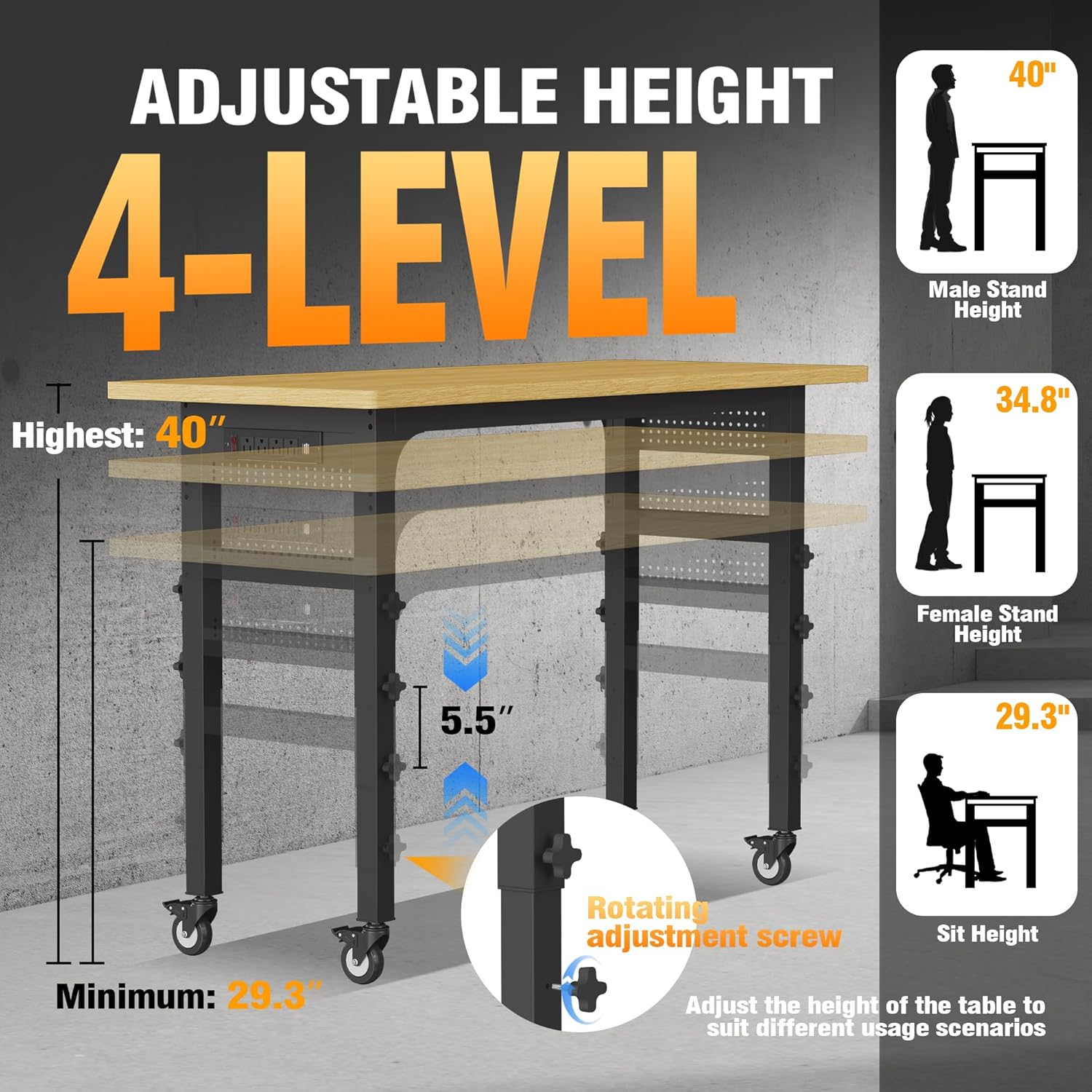 - Multi-Level Height Adjustable: Without additional tools, the workbench can be adjusted to 4 different heights from 29.3" to 40", allowing you to work more comfortably standing or sitting, preventing you from staying in the same position for a long time