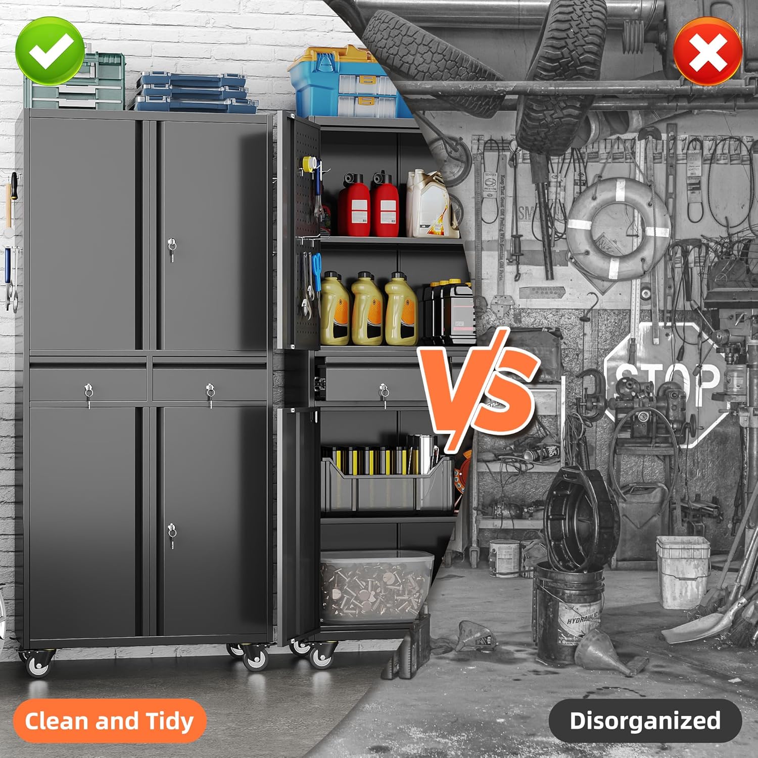 - 【2 Adjustable Shelves】 Locking cabinet on wheels has 2 adjustable shelves. The shelves can be adjusted up and down to the desired position for your household items, tools, and other items. this tall metal cabinet also has an interior design that adds extra space to any room