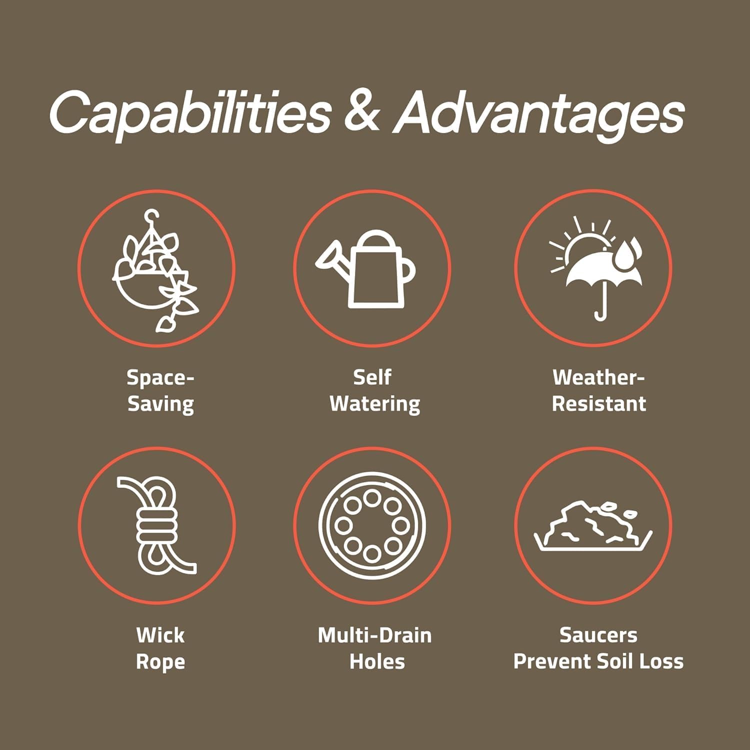 - LOW-MAINTENANCE CARE – Heading on vacation? These self watering hanging pots got you covered. The deep reservoir & watering rope keep your plants hydrated for weeks. Each pot also features a convenient watering lip for easy top-ups without unhooking.