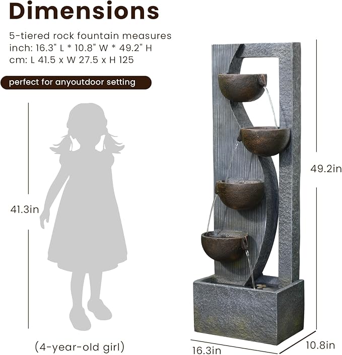- 🌊 5-Tier Cascading Waterfall Design: Experience serene ambiance with this outdoor waterfall fountain featuring five gently cascading tiers, mimicking natural stone textures for an elegant garden fountain centerpiece.