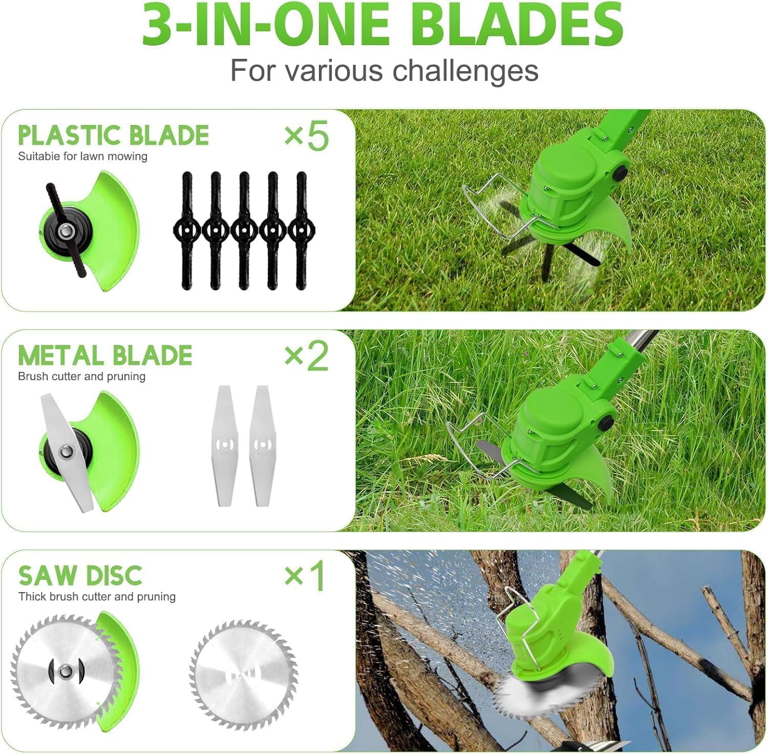 - 3-in-1 Weed & Brush Cutter: This cordless electric trimmer features 5 durable plastic blades for efficient weed cutting, mowing, and edging without damaging your lawn. For optimal performance, we recommend allowing the machine to rest for about 15 minutes after 30-45 minutes of use to let the motor cool down.