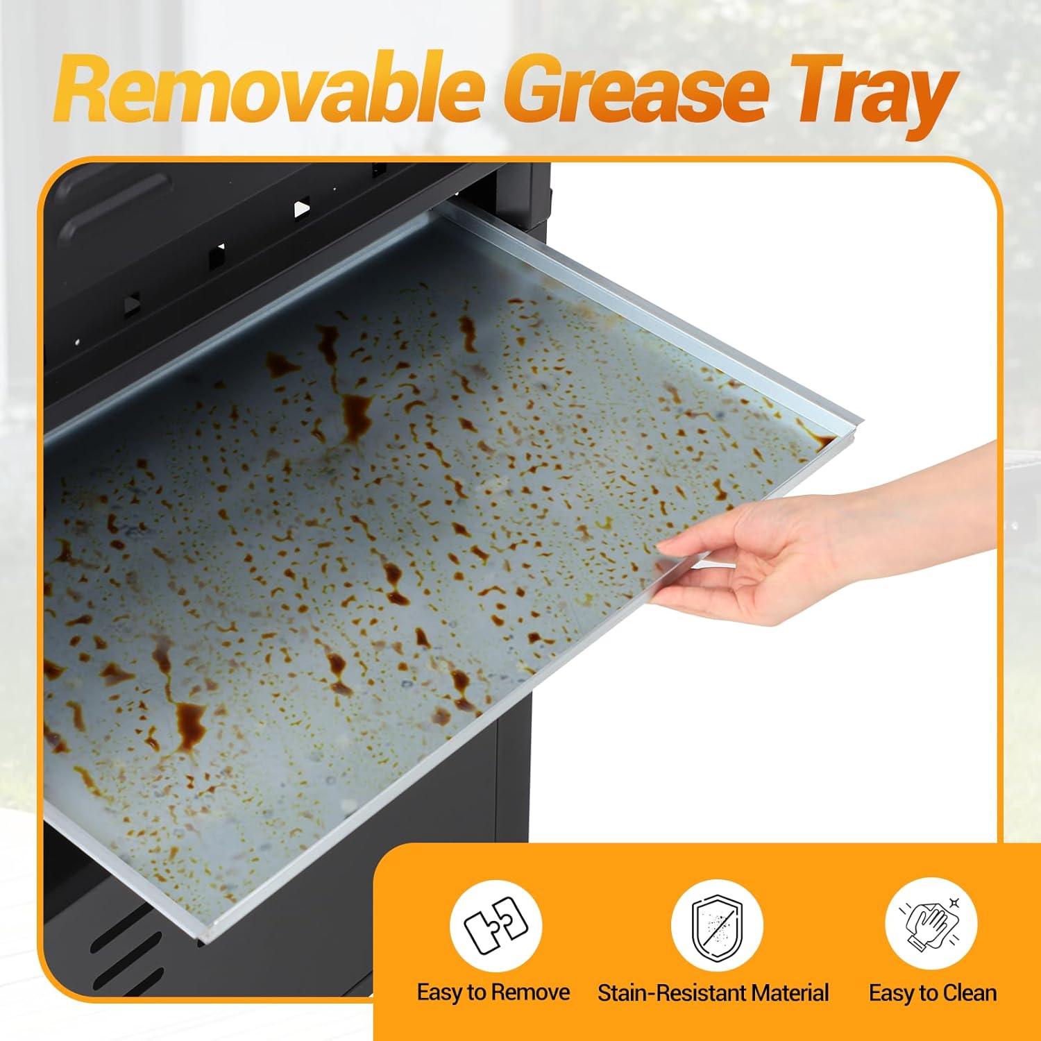 - Removable Grease Tray + Bonus Grill Brush: Enjoy hassle-free maintenance with the removable grease tray that catches drips and grease while you cook. Cleaning is a breeze — and to make it even easier, we’ve included a durable grill brush to help you scrub the grates spotless after every cookout.