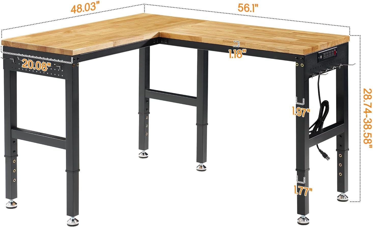 Albott 56"x48" L-Shaped Adjustable Workbench with Storage & Power Strip, Heavy Duty Tool Bench for Woodworking, Garage, Workshop, Home Office, 6000LBS Load, Pegboard & Hooks, ETL Certified