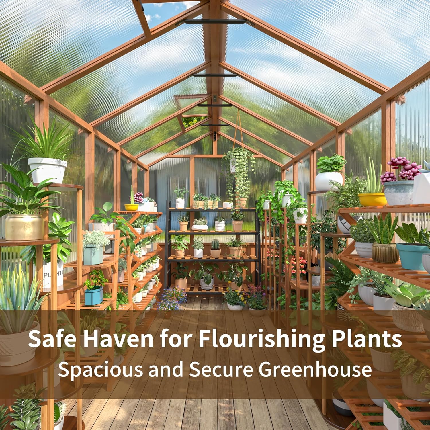 6x12 FT Wooden Greenhouse for Outdoors, Walk-in Greenhouse with 6MM Thick Polycarbonate Panel and Adjustable Roof Vents, Garden Backyard, Wood Colour
