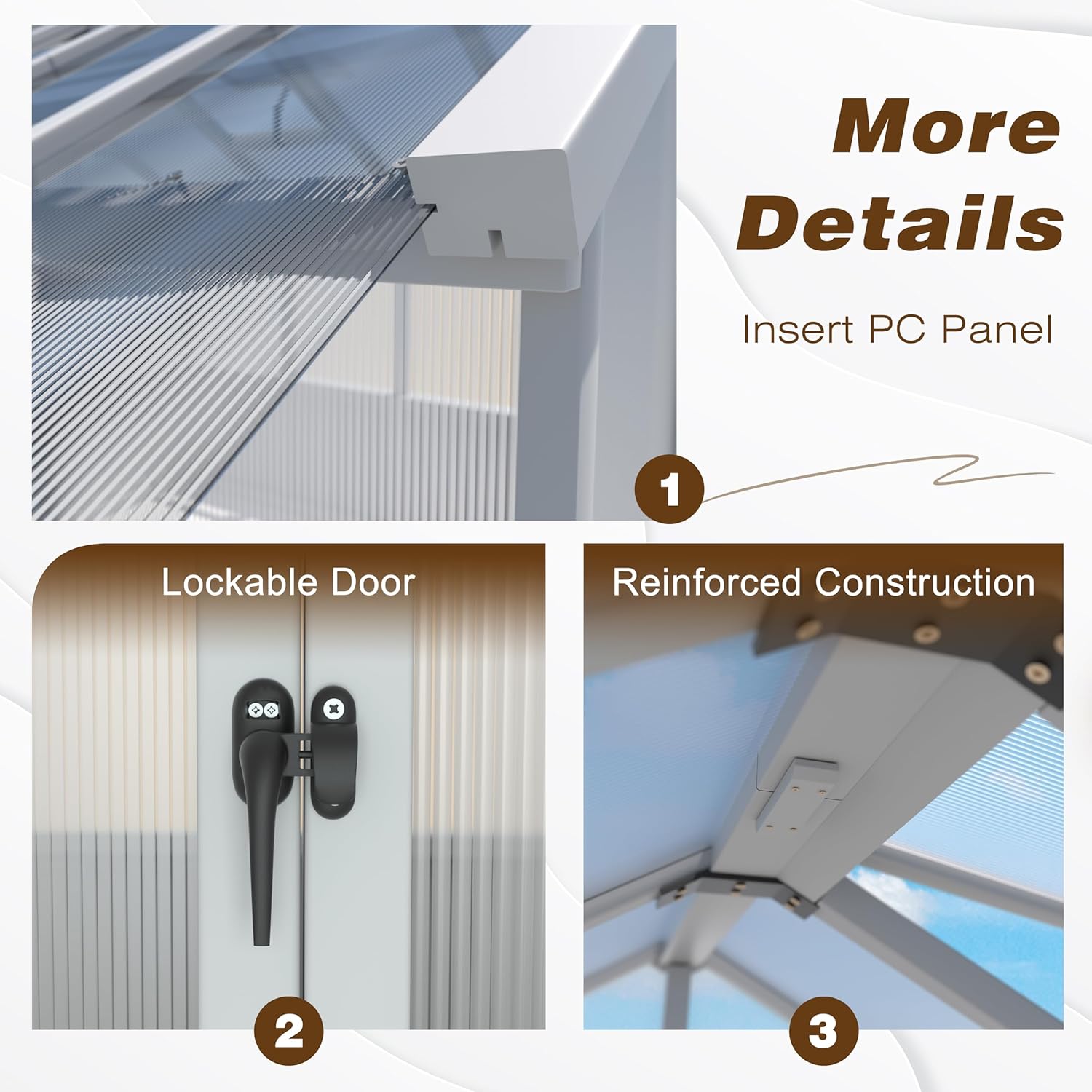 - Upgraded Polycarbonate Panel: Yardenaler greenhouse kit uses multi layers polycarbonate panel to provide high light transmission and UV protection. They allow light transmission for plant growth while blocking over harmful UV rays. It is beneficial for the better growth of your plants