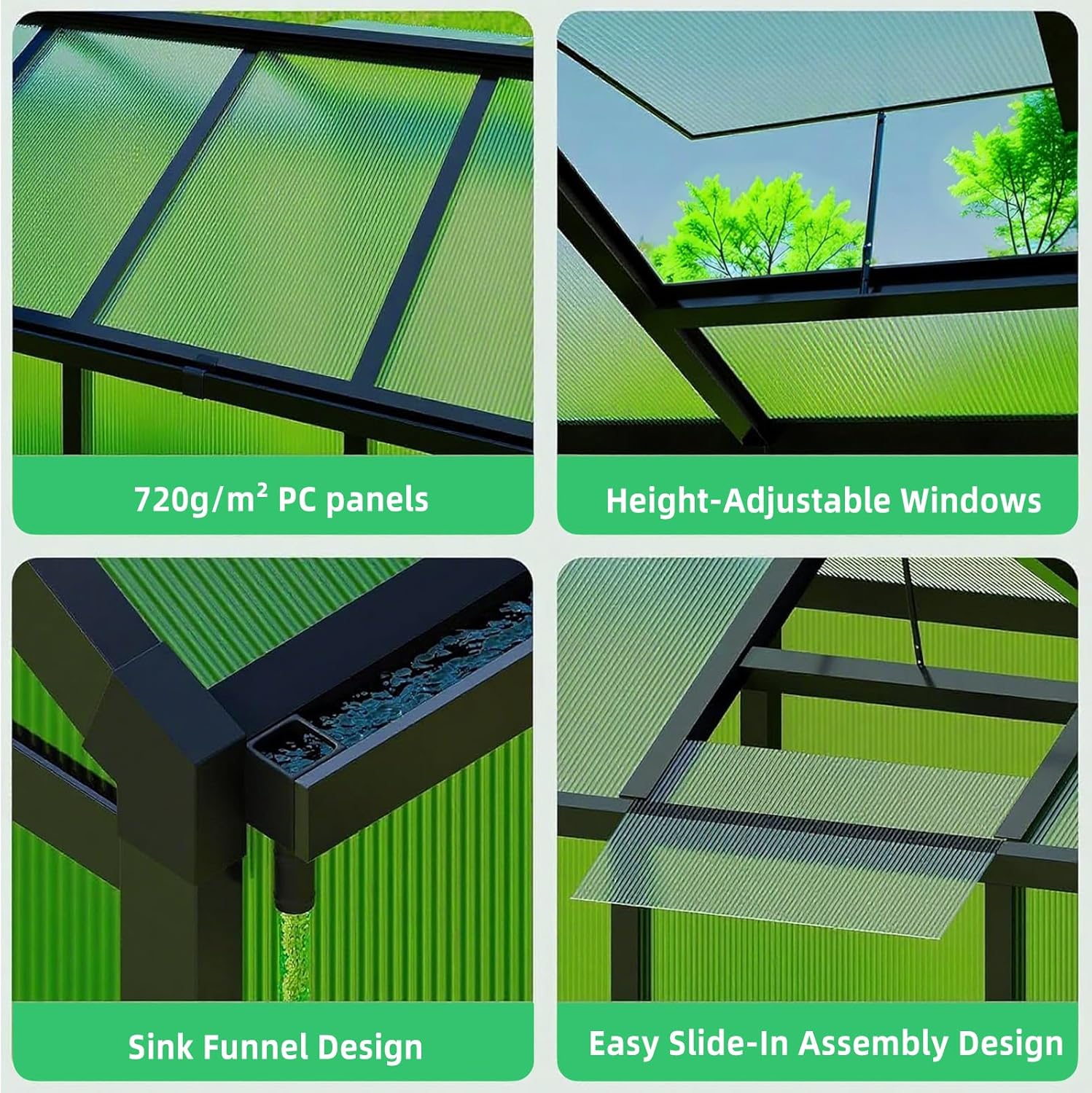 - Superior ventilation and spacious layout define this thoughtfully designed structure. Dual roof vents and a wide lockable door promote exceptional air circulation, while the generous 8x10FT interior accommodates multiple planting tiers, hanging baskets, and shelving units. This green houses for outside offers both vertical and horizontal space optimization for cultivating everything from seedlings to mature crops.