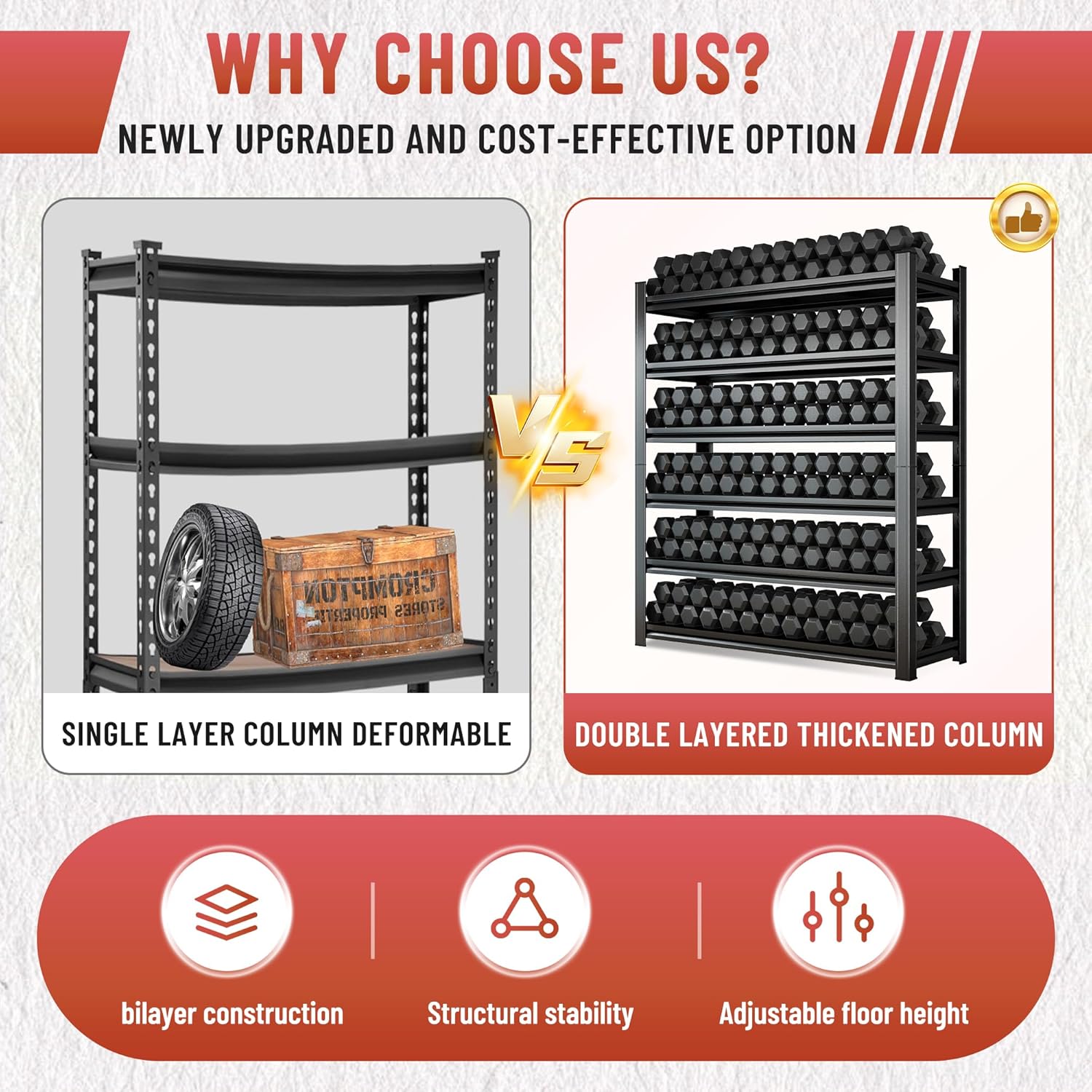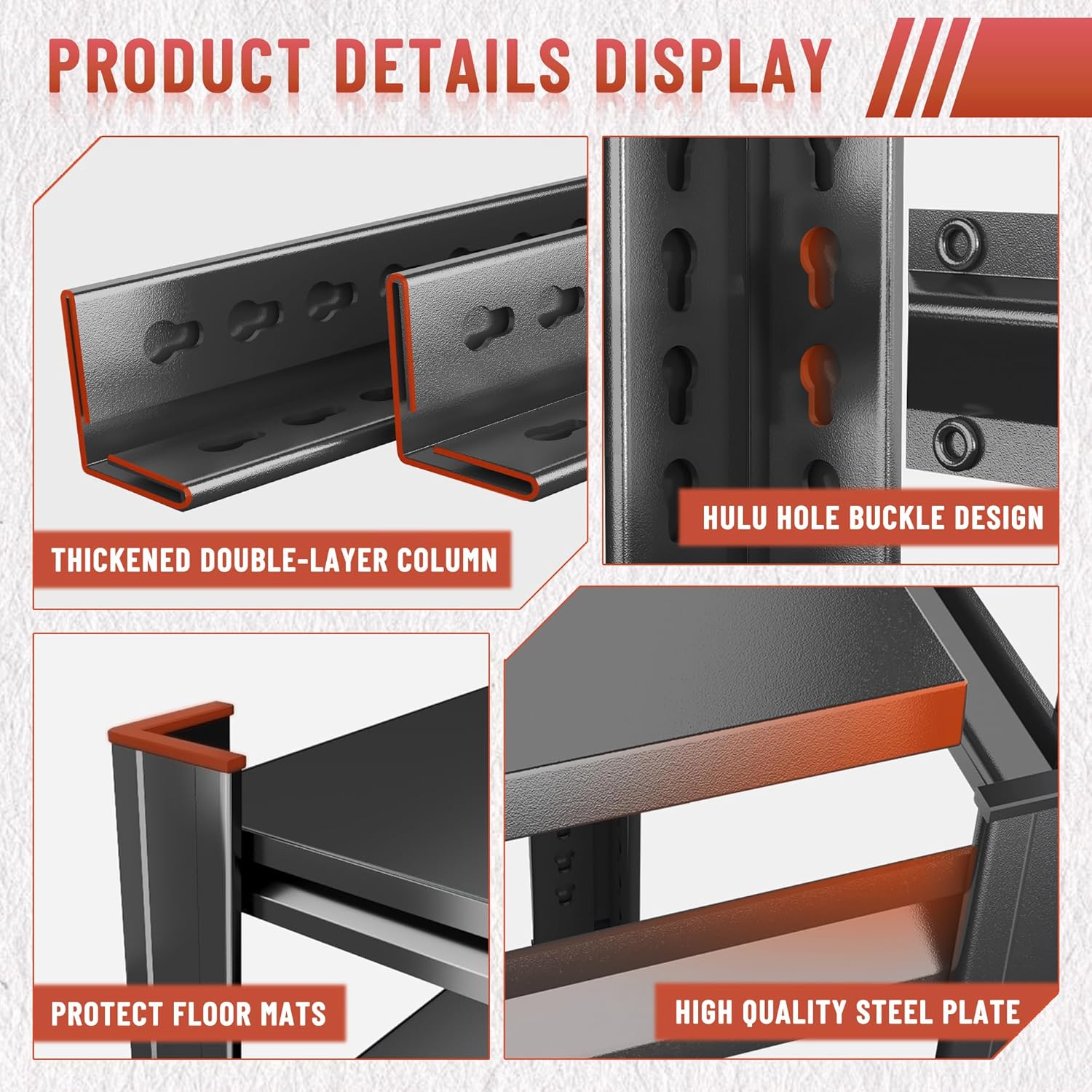 - 【Double-Thick Uprights for Enhanced Support】Featuring double-thick uprights, this shelving system provides superior reinforcement. The extra layer of strength guarantees that the Garage Shelving can handle heavy loads while maintaining its structural integrity