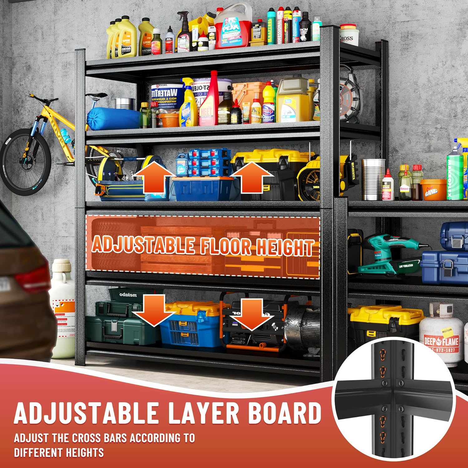 - 【Perfect for Various Storage Needs】Whether you're organizing tools, equipment, or household items, this versatile Garage Shelving is ideal for a wide range of applications. Its high weight capacity and durable construction make it the perfect addition to any garage, workshop, or storage area