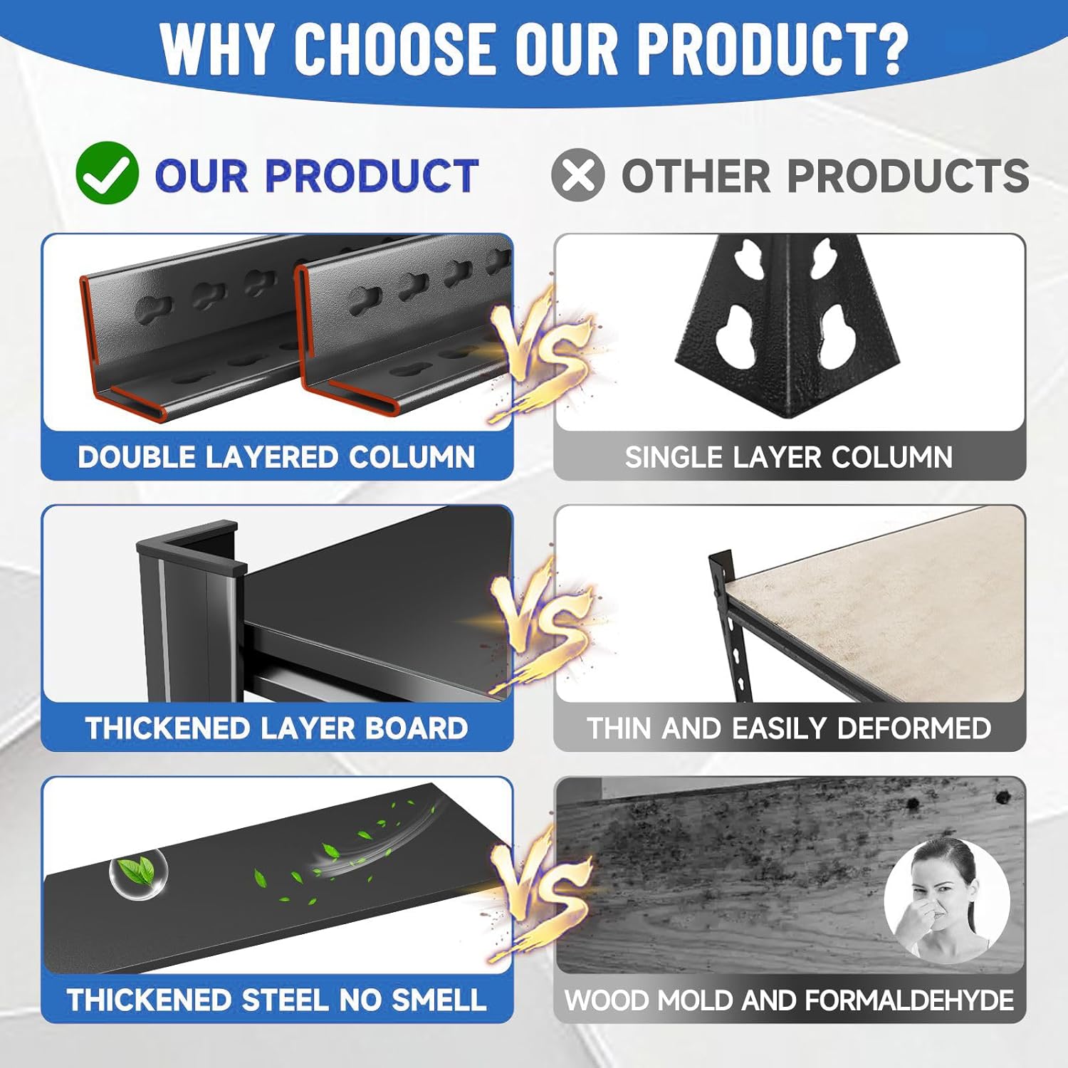 - 【Quick installation of a set of garage storage shelves in 10 minutes】This metal storage shelf adopts an interlocking design, which does not require any bolts or nuts for installation. It does not even require any installation tools. A set of 5-Tier metal shelves can be installed by hand in 10 minutes.